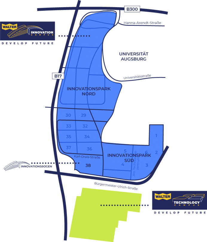 Durch die Kombination von geplanten und vorhandenen Einrichtungen können die benachbarten Areale INNOVATION CAMPUS und der TECHNOLOGY CAMPUS zu einem neuen Wissens- und Entwicklungszentrum mit zahlreichen Chancen für Synergien zusammenwachsen. Die unmittelbare Nähe zur Universität Augsburg sowie verschiedener Forschungsinstitute schafft eine bislang einmalige Kombination von Lehre, Forschung sowie Entwicklung und Produktion. Innovation und High-tech haben hier einen neuen Premium- Standort.
