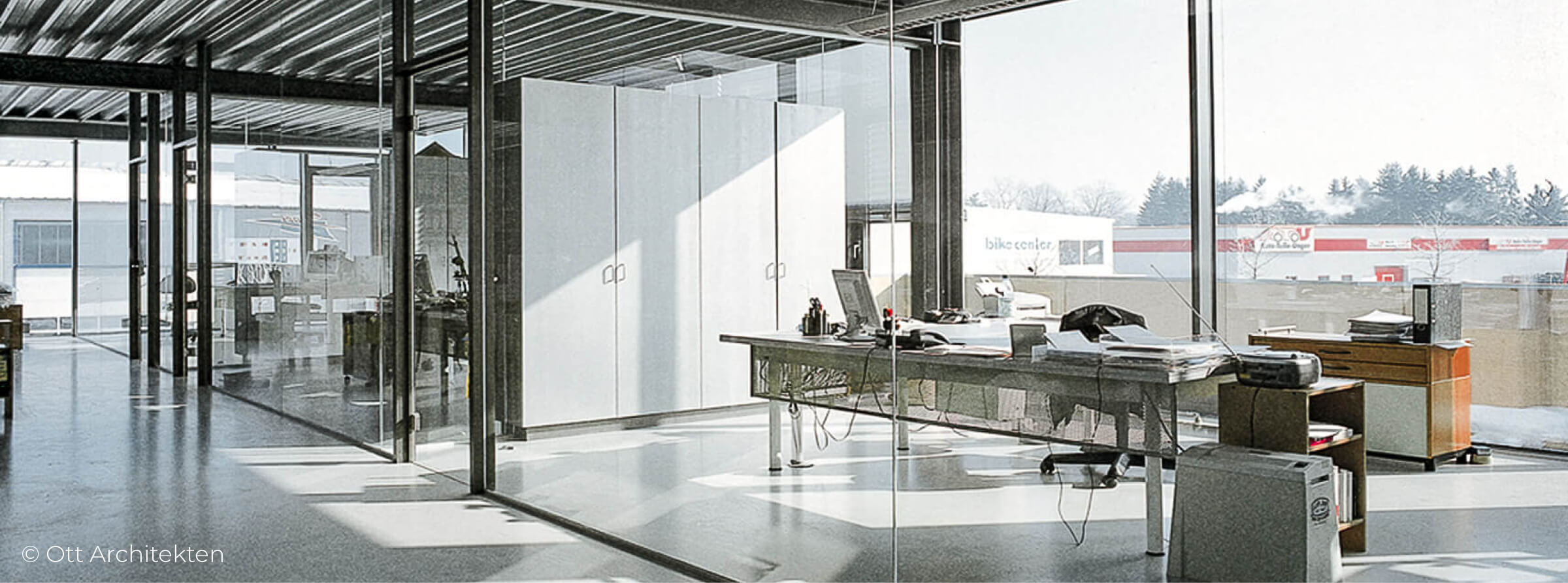 Stahlbeton-Skelettbauweise mit Fensterbändern, Stilistische Außengestaltung der Fassade und LKW-Andienung möglich -